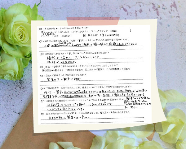 メッセージを使ったやり取りがスムーズで営業の方の対応も親身で良かったです!営業さんが現場を見に来たくださった際、電気屋さんも一緒にきていたらもう少し早く外灯が直ったかなと思いました。名古屋市瑞穂区/M邸Q1:当社をお知りになったきっかけを教えてください ☑ ホームペー…