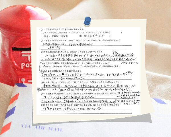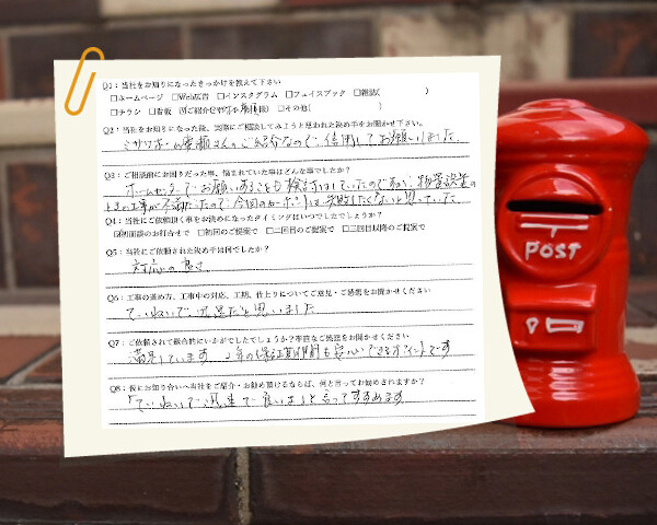 他社よりも丁寧なヒアリングで、現在の生活スタイルや施工後の劣化などを踏まえたうえでお話して頂けました。強いて言えば、工事前の近隣挨拶をどこまでの範囲にしたのか教えていただけたらよかったなと思います!名古屋市中川区/M邸Q1:当社をお知りになったきっかけを教えてください ☑ その他(…