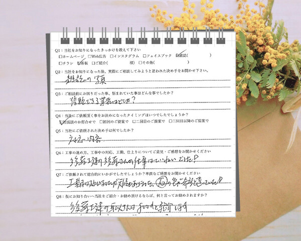 2社相見積もりをとってオールグリーンさんのが安かったことと担当者さんの人柄が依頼の決め手となりました。工事完了を見に来て頂けなかったことが気になりましたが総合的には満足しておりまたお願いしたいです!愛知県春日井市/M邸Q1:当社をお知りになったきっかけを教えてください ☑ その他(…