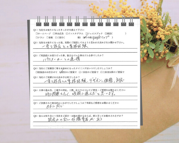 デザイン、価格、対応がよく依頼の決め手となりました。工事の進め方も特に問題なく、順調に進んだと思います!総合力の高い外構業者があるとオススメしたいです!名古屋市中川区/K邸Q1:当社をお知りになったきっかけを教えてください ☑ その他(…