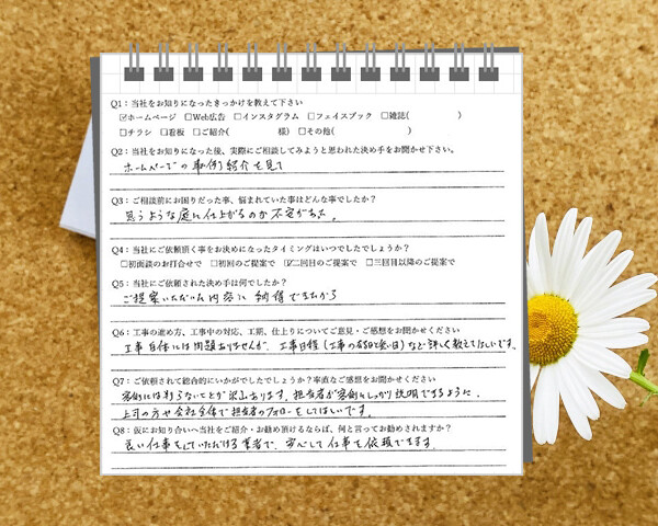 ご提案内容に納得ができ、工事自体にも問題なくよかったです!工事をやる日、やらない日の工事日程をもう少し詳しく教えていただけたらよかったなと思います。名古屋市天白区/I邸Q1:当社をお知りになったきっかけを教えてください ☑ ホームペー…