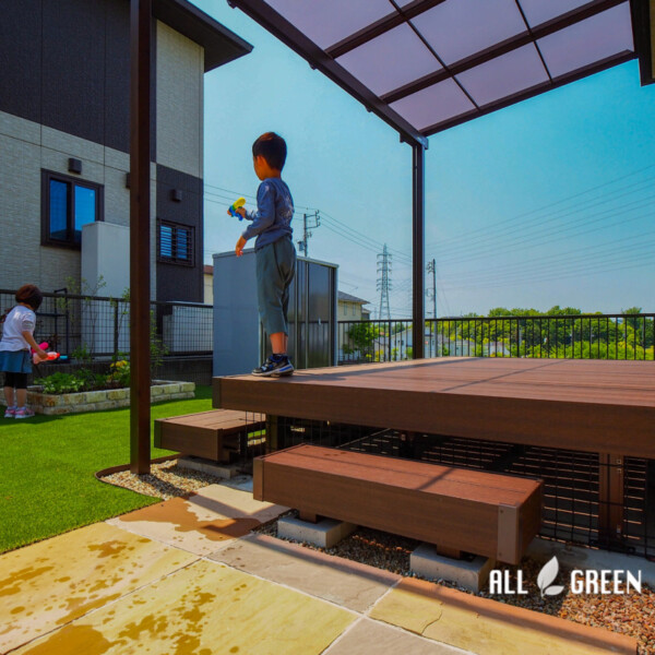 愛知県豊明市 テラス屋根とウッドデッキを一新!リフォーム外構で愛犬も喜ぶお庭づくり!天然木の味を感じられるテラス屋根とウッドデッキで家族も愛犬もニッコリ 住宅営業さんを介してオールグリーンを知って下さり、ご相談にきて…
