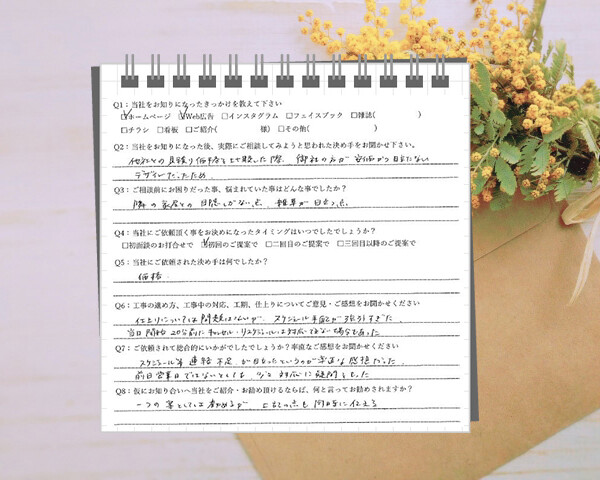 担当社員さんや業者さんがとても気持ちの良い対応をして頂き、安心してお任せすることができました!見た目の仕上り、実用性ともに大変満足しております。ありがとうございました!名古屋市守山区/T邸Q1:当社をお知りになったきっかけを教えてください ☑ ご紹介(…