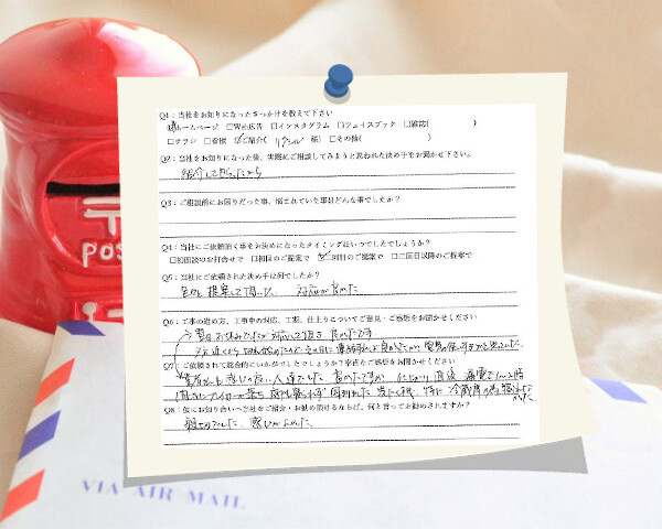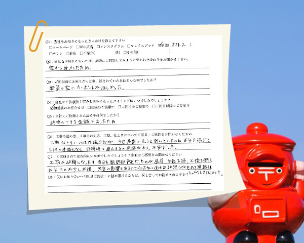 家から近く、新築の家にカーポートが欲しかったため相談に伺いました。工期や仕上がりには満足ですが時間が後ろ倒しになったり、連絡が無かったりという面が多々あり不安になりました。愛知県春日井市/W邸Q1:当社をお知りになったきっかけを教えてください ☑ 雑誌( ポ…