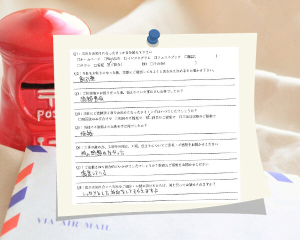 日程に都合がつけられず、工事中留守にしてしまいましたがキチンとやっていただけました!当初の予定と違う高さで仕上がってしまっていた部分は適切に対応していただけて良かったです!名古屋市瑞穂区/S邸Q1:当社をお知りになったきっかけを教えてください ☑ チラシ &…