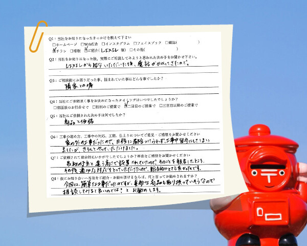 やりたい工事がどのくらいの総額になるかや割引の有無など費用面で悩んでいましたが適正な価格かつ、しっかりとした対応で満足のいく工事となりました。愛知県春日井市/K邸Q1:当社をお知りになったきっかけを教えてください ☑ ご紹介(…