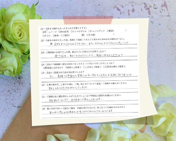 愛知県稲沢市/K邸 小さい子供がいるので、自宅で打ち合わせができると知り大変助かりました。工事対応や仕上がりも申し分なく満足しております。素早く工事して頂きありがとうございました!Q1:当社をお知りになったきっかけを教えてください ☑ ホームペー…