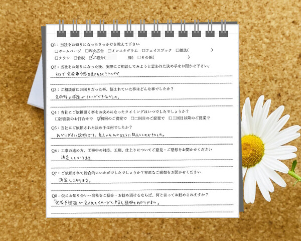 3Dで完成イメージ図をみせてもらい、素人にもわかりやすい説明をしてくださいました。とても満足しています!名古屋市中村区/S邸Q1:当社をお知りになったきっかけを教えてください ☑ ご紹介 (…
