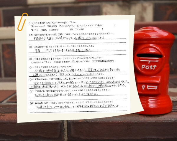 以前依頼してやっていただいた工事に満足したため、また依頼を決めました。今回の工事も大きな問題なく満足です!要望や相談事を親身に聞いてもらえることをオススメしたいです!名古屋市名東区/K邸Q1:当社をお知りになったきっかけを教えてください ☑ Web広告…