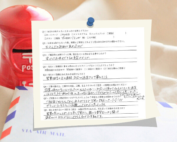 設置時少し傾きが気になったので連絡をするとすぐに対応をしていただけました。営業の方の対応の迅速さと丁寧さがとってもよかったです!名古屋市守山区/D邸Q1:当社をお知りになったきっかけを教えてください ☑ ご紹介(…
