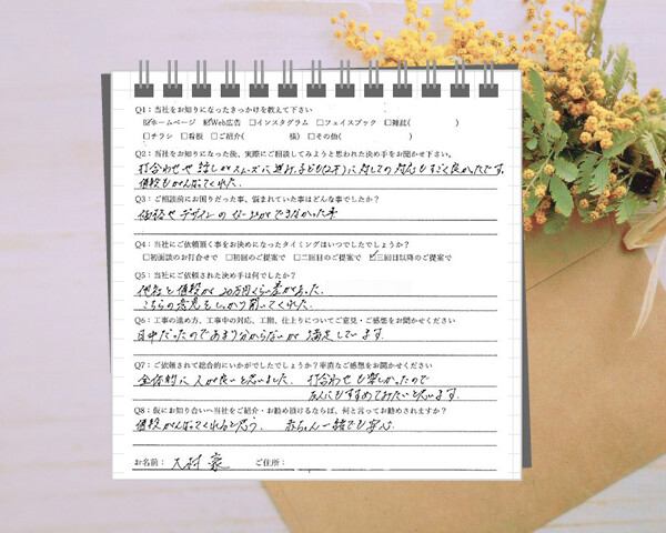 全体的に人が良いと思いました。2才の子どもに対しての対応もすごく良く、赤ちゃんが一緒でも安心して来店できるお店だよとオススメしたいです!愛知県あま市/大村様邸Q1:当社をお知りになったきっかけを教えてください ☑ ホームペー…