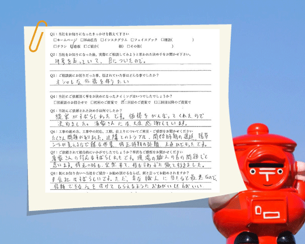 担当営業さんの提案・対応が素晴らしかったですが、職人さんの雑な作業、修正時期の遅延、正直ひどかったです。愛知県春日井市/Y邸Q1:当社をお知りになったきっかけを教えてください ☑ 看板…
