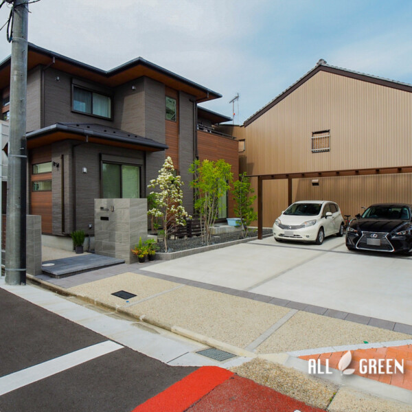 理想の庭空間で彩る名古屋市南区の新築外構邸宅と調和で理想のファサードを! ホームページを見て新築外構のご相談に来てくださったお客様。 ブラックとブラウンを基調としたモダンな…
