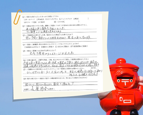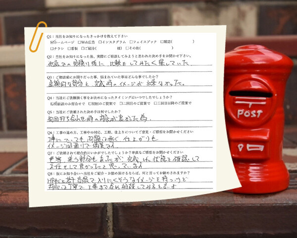 ホームページだと若干高級で入りにくそうなイメージを持つけど、実際は対応が丁寧で工事も問題なくイメージ通り!金額含め一度相談してみるといいですよ!愛知県春日井市/T邸Q1:当社をお知りになったきっかけを教えてください ☑ ホームペー…