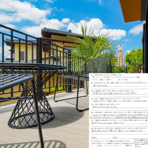 担当営業さんの対応が良く、工事もスムーズに進めて下さり満足していますが、フェンスが追加工事になってしまった点だけ残念でした。名古屋市千種区/K邸Q1:当社をお知りになったきっかけを教えてください ☑ ホームペー…