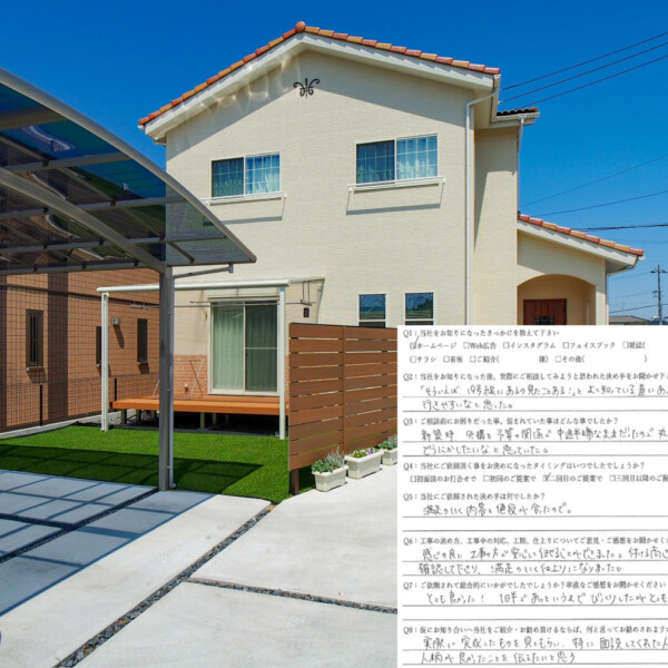 オプションについての説明が少なかったのと工事日程に変更が出た点だけ残念でしたが、ネットと違いしっかり実店舗で相談ができる安心感と、イメージ3Dが見れるところがよかった!価格も想定内です!愛知県春日井市/T邸Q1:当社をお知りになったきっかけを教えてください ☑ チラシ…