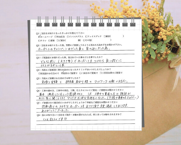 どんな感じでどんな大きさのカーポートを設置したらいい感じに仕上がるのか悩んでいましたが、図面通りのステキなカーポートを立てて頂き、大変満足しております。満足しているという前提で1点だけ、工事中の業者さんの雑談が気になりました。愛知県春日井市/T邸Q1:当社をお知りになったきっかけを教えてください ☑ ホームペー…
