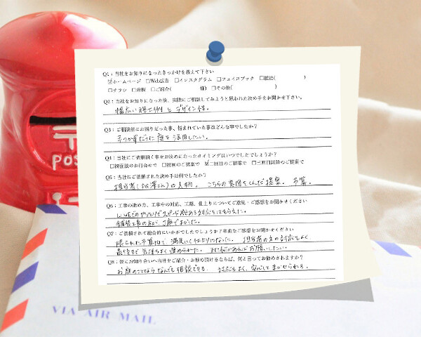 伺っていたスケジュールよりズレが生じ、入居のタイミングが決まり難かったです。それ以外は満足で提案された外構のデザインが良く、担当の営業さんがすごく話し易い方でした。愛知県北名古屋市/M邸Q1:当社をお知りになったきっかけを教えてください ☑ ホームペー…