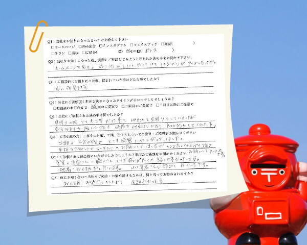 工事の進め方や工事中の対応など特に問題なく、依頼して良かった!大満足です!予算内で理想に近い提案をしてくれると周囲にオススメしたいです!名古屋市中村区/O邸Q1:当社をお知りになったきっかけを教えてください ☑ Web広告…