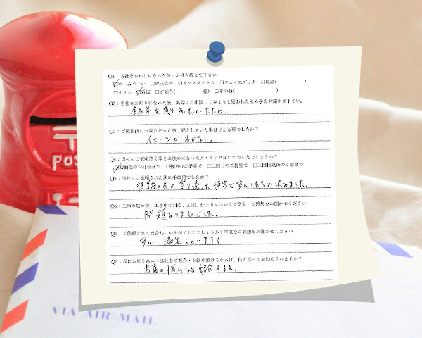 相見積りを何社かとっていましたが、同じ予算内でも他社とは違った発想の提案をしてくれました。デザインが気に入ってオールグリーンに決めましたが、完成すると提案時の感動を超える使いやすさでとても満足しています!名古屋市瑞穂区/K邸Q1:当社をお知りになったきっかけを教えてください ☑ ホームペー…