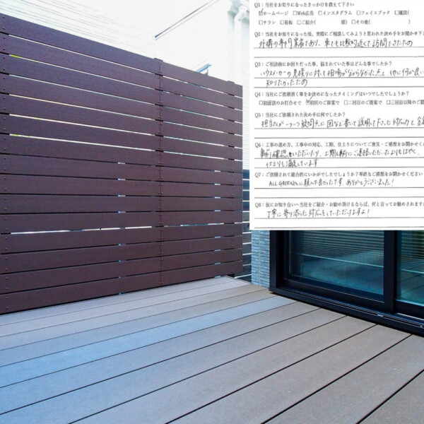 担当さんが一つ一つ疑問点に対して図などで説明して下さり、丁寧に寄り添った対応をして頂けました。ALLGREENさんに頼んで良かったです!ありがとうございました!名古屋市西区/H邸Q1:当社をお知りになったきっかけを教えてください ☑ ホームペー…