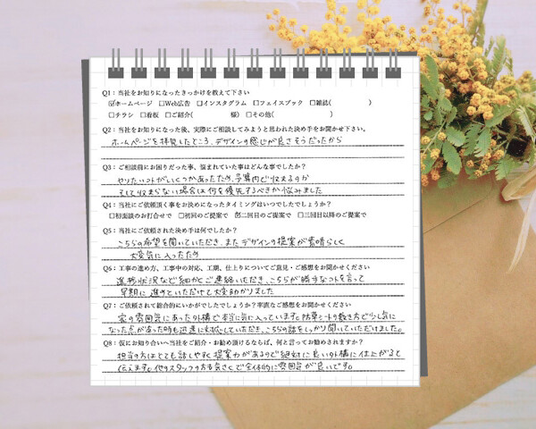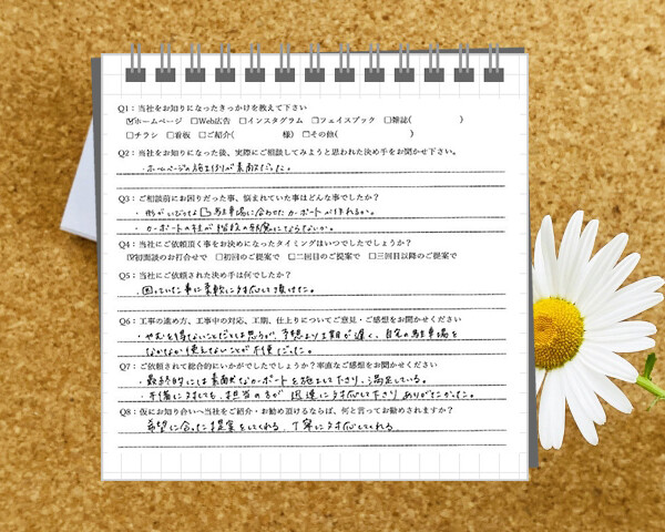 リピーターです。前回工事をやっていただいた際、気持ちの良い対応をして頂いたのでまた工事をお願いしました。担当営業さんの人柄がよく、間違いない会社!またお願いしたいなと思います。愛知県北名古屋市/T邸Q1:当社をお知りになったきっかけを教えてください ☑ その他(…