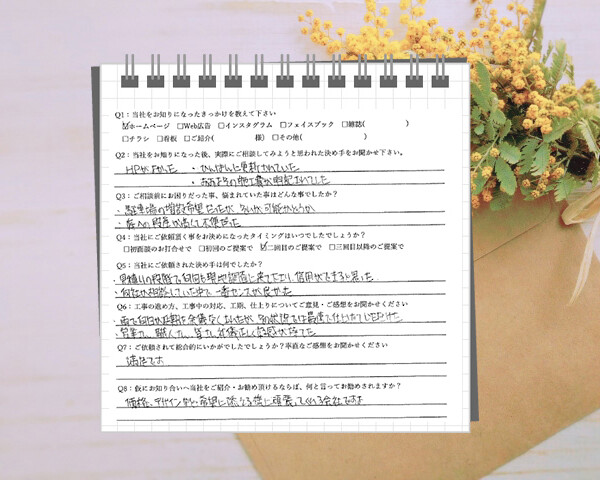 愛犬同席化のお店の雰囲気とスタッフの人柄が良かった。自分の頭では考えつかない提案力があり、最初から最後まで安心しておまかせすることができました。大変満足しております。岐阜県不破郡 /M邸Q1:当社をお知りになったきっかけを教えてください ☑ その他(…