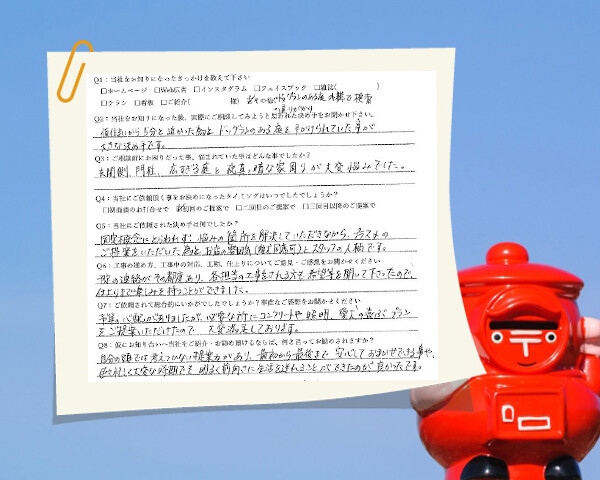 よしずにクマバチがついていたことに悩んでいました。担当者さんの人柄と良い提案、そして他より2割安く工事できてグッジョブでした。名古屋市西区 /A邸Q1:当社をお知りになったきっかけを教えてください ☑ ホームペー…