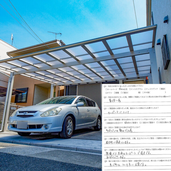 Web広告でオールグリーンを知り、家が近い為相談に伺いました。対応がとても親切で、良心的なとても良いお店です。想像より立派なカーポートで総合的に満足です。名古屋市中川区 /S邸Q1:当社をお知りになったきっかけを教えてください ☑ Web広告…